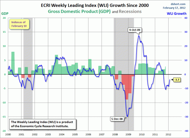 The Weekly Leading Index (WLI) growth indicator of the Economic Cycle Research Institute (ECRI) came in at -3.7 in today’s public release of the data through February 10th. This is the fifth consecutive week of improvement (less negative) data for the Growth Index and the highest level (i.e., least negative) since August 26th of last year. The underlying WLI decreased fractionally from an adjusted 123.6 to 123.5 (see the third chart below).