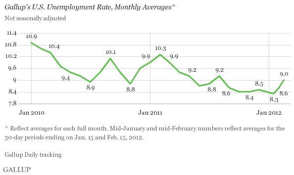 The U.S. unemployment rate, as measured by Gallup without seasonal adjustment, is 9.0% in mid-February, up from 8.6% for January. The mid-month reading normally reflects what the U.S. government reports for the entire month, and is up from 8.3% in mid-January.