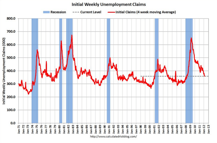 The last two weekly readings for claims were the lowest since March 2008, just three months after the deep recession began. Initial filings peaked above 650,000 in March 2009.