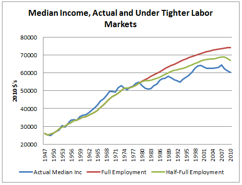 Another big distinction between these two roughly 30 year periods was the tightness of the labor market. Over the first period, 1947-1979, the average unemployment rate was 5.1 percent; over the second period, 1979-2010, it was 6.3 percent (6.1 percent through 2007). That doesn’t sound like that big a difference in terms of labor market tightness, but it is. Let me explain.
