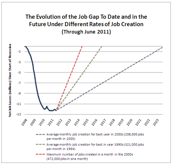 Source: http://www.brookings.edu/opinions/2011/0708_jobs_greenstone_looney.aspx#“If the economy adds about 208,000 jobs per month, which was the average monthly rate for the best year of job creation in the 2000s, then it will take until October 2023—over 12 years—to close the job gap. Given a more optimistic rate of 321,000 jobs per month, which was the average monthly rate for the best year of job creation in the 1990s, the economy will reach pre-recession employment levels by September 2016—over five years.” conclude the authors.