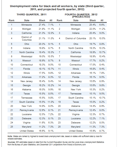 Among the states with sufficient data for reliable estimates, African American unemployment rates exceeded 10 percent in 24 states and the District of Columbia in the third quarter of 2011, while unemployment rates for Latinos exceeded this symbolic threshold in 14 states. If our political leaders fail to quickly enact bold measures to spur a faster economic recovery, the status quo of high unemployment rates for African Americans and Latinos is likely to persist throughout 2012…