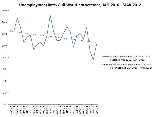 On Friday, the Bureau of Labor Statistics released Veteran unemployment data for the month of March. The unemployment rate for one closely watched group, Iraq and Afghanistan-era Veterans (or Gulf War II-era Veterans), was 10.3 percent. While this reflects a higher number than in February, the trend over the past 27 months—since January 2010—remains downward for America’s most recent Veterans…