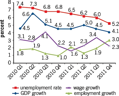 In a sample of developing countries, growth in the fourth quarter of 2011 slowed amidst considerable economic uncertainty. Figure 1 shows median growth rates of output, employment, wages, and the median unemployment rate for 11 countries with complete series on all four indicators. Median growth in gross domestic product (GDP) weakened slightly over the fourth quarter in the previous year, from 4.5 to 4.1 percent, most likely reflecting continued uncertainty over financial and fiscal conditions in parts of the European Union. The median unemployment rate also fell significantly, down to 5.2 percent from nearly 7 percent the previous year and 6 percent the previous quarter. Formerly unemployed workers were absorbed into the workforce as employment growth rose from 1.9 percent the previous quarter to 3 percent. Employment also partially benefited from moderate wage growth, which weakened slightly from the previous quarter…