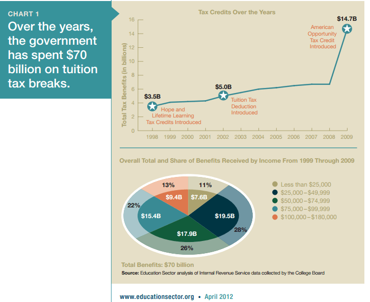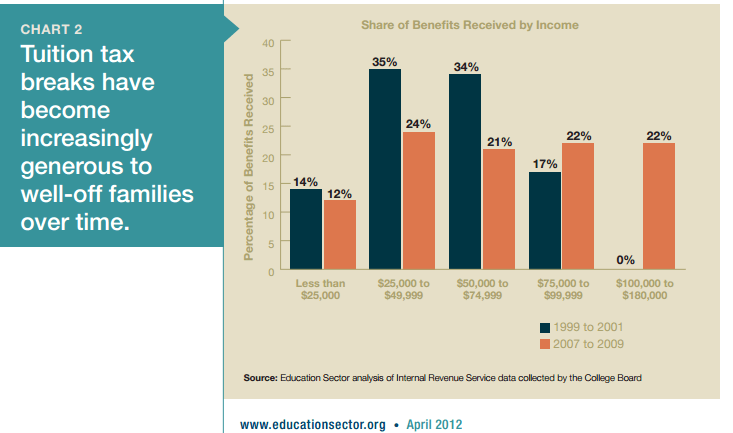 and http://fulltextreports.com/2012/04/25/for-release-eliminate-college-tuition-tax-breaks-new-education-sector-report-argues/Read More @ Moving On Up: How Tuition Tax Breaks Increasingly Favor the Upper-Middle Class | Education Sector.