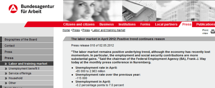 German unemployment has been the biggest advertisement for Chancellor Angela Merkel’s prescription to quell the debt crisis with budget cuts and labor-market changes as part of an economic overhaul. Separate European figures published by the Luxembourg- based statistics agency Eurostat today showed euro-region unemployment rose to 10.9 percent in March, the highest in almost 15 years and almost double Germany’s rate of 5.6 percent…