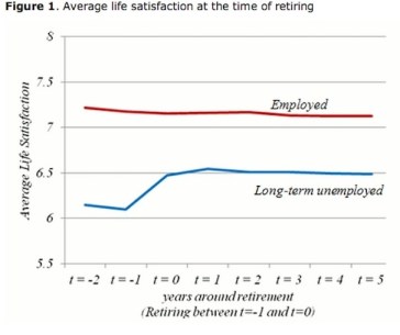 When the long-term unemployed decide to enter retirement — which changes their social status but nothing else about their situation — their sense of well-being shoots up, while those who are employed don’t experience the same effect. This suggests just how much the psychological burden — and perhaps, the social stigma — of being unemployed is weighing on the minds of those out of work for long periods of time.