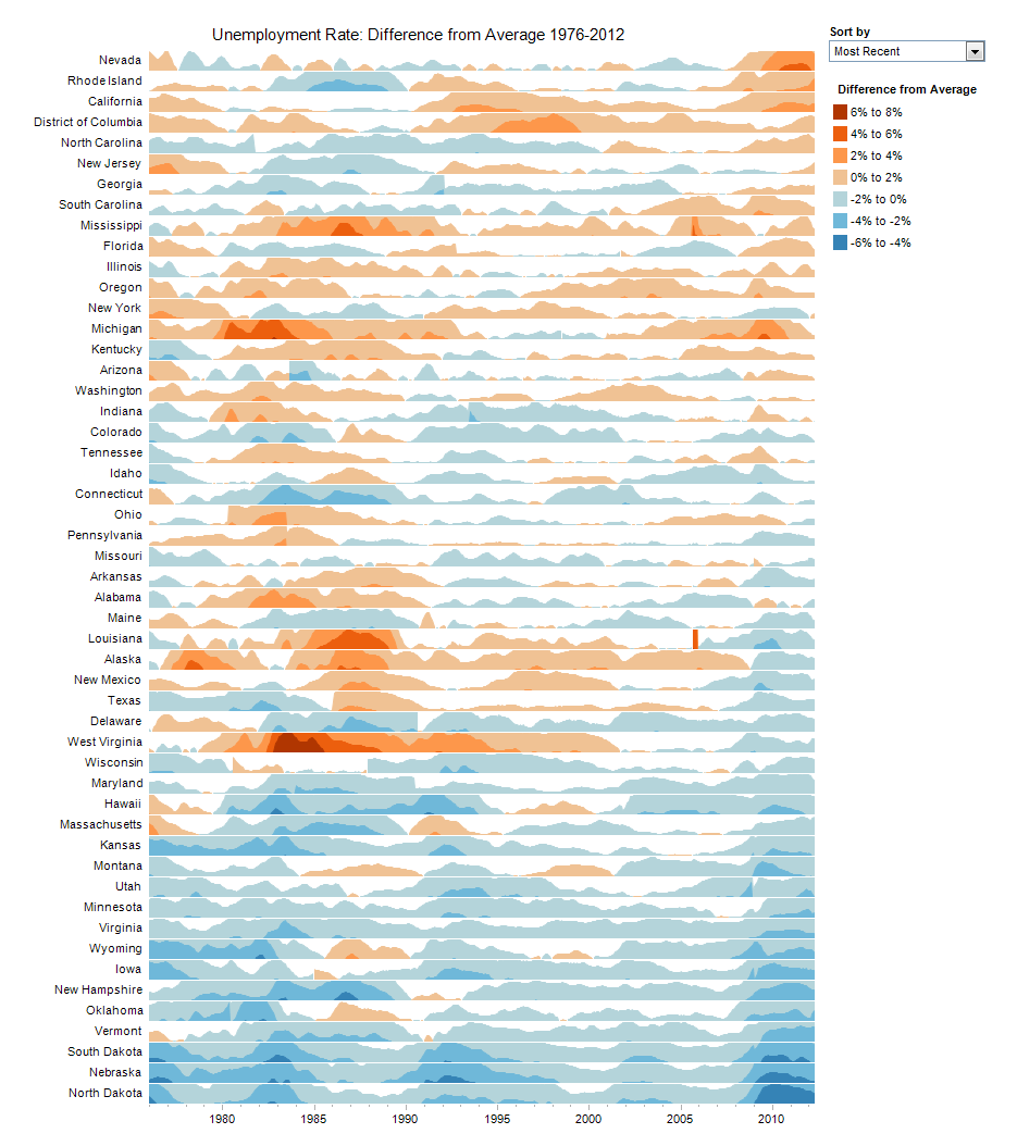 Joe Mako has used Tableau to plot unemployment relative to the national average for every US state between 1976 and 2012. The aptly named horizon chart represents values using both colour and dimensions. In this case orange and red shading indicate an unemployment rate above the national average, while shades of blue show the inverse. A coloured area’s height corresponds to the numerical value for that year, and where a shaded area reaches the top of its vertical scale an area in a darker tone is overlain showing the same again. Note the spike in Louisiana following Hurricane Katrina…