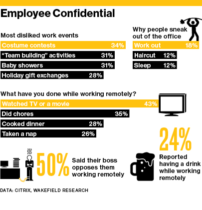 Employees might not even be sober: 24 percent admit to having a drink. Twenty-six percent say they take naps. Others are distracted by housekeeping: 35 percent do household chores; 28 percent cook dinner.