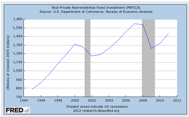 Note from JMM: Has shown by the first figure, Corporate Profits are a very good cyclical indicator. They drop during recession (the shaded areas), together with investment (FIG 2) . As some economist says: Workers spend what they earn, capitalists earn what they spend.