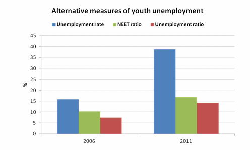 The limitations of the unemployment rate as a measure of labour market conditions among the youth population is acknowledged by Eurostat, who now publish both the ratio and the rate for the population aged 15-24. (Their recent figures for Ireland for 2011 are low and may not reflect the latest Census returns.)