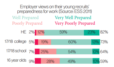 Young people’s work readiness is a persistent theme when discussing youth employment but there is a risk that it is overstated. The UK Commission’s comprehensive evidence shows that only a minority of employers have recruited from education in the last two to three years. Overall this minority tend to find their young recruits well or very well prepared and where they do not they put this down to lack of experience.