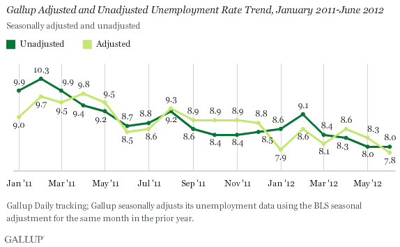 U.S. unemployment, as measured by Gallup without seasonal adjustment, was 8.0% in June, unchanged from May, but significantly better than the 8.7% from a year ago. Gallup’s seasonally adjusted number, based on applying an estimate of the government’s June adjustment, is 7.8%, an improvement from 8.3% in May, and down considerably from 8.5% in June 2011. Both the unadjusted and the adjusted numbers are at least tied for the lowest Gallup has recorded since it began collecting employment data in 2010.