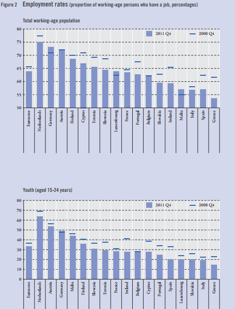 Young people are increasingly at risk of a scarring first experience in the world of work, which could affect them for the rest of their life. In April 2012, the youth unemployment rate in the Eurozone was over 22 per cent. It exceeded 30 per cent in Italy, Portugal and Slovakia and was over 50 per cent in Greece and Spain. Youth unemployment rates also remained relatively high in successfully performing countries, such as Belgium and Malta.
