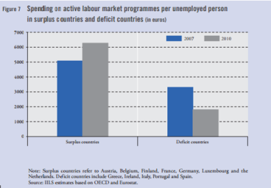 Yet, spending on active labour market policies – measured per unemployed person – has tended to decrease in recession-hit Eurozone countries (figure 7). The opposite holds true in relatively better off countries.