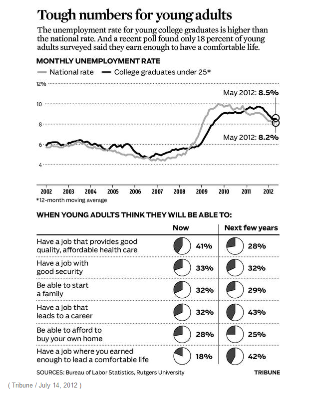 market and a painfully slow recovery. Many young adults who have found work are languishing in low-paying, no-benefit jobs that don’t require degrees. Some still live with their parents and are saddled with debt, delaying full-fledged adulthood indefinitely.