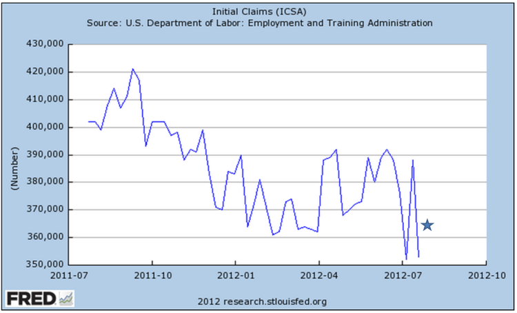 In the week ending July 28 the advance figure for seasonally adjusted initial claims was 365,000, an increase of 8,000 from the previous week’s revised figure of 357,000. The 4-week moving average was 365,500, a decrease of 2,750 from the previous week’s revised average of 368,250.