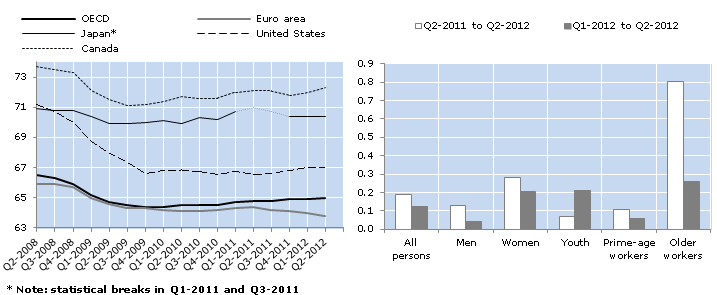 The OECD area employment rate – defined as the proportion of people of working-age who are employed – was 65.0% in the second quarter of 2012. This figure is 0.1 percentage point higher than in the previous quarter and 0.2 percentage point higher than one year ago.