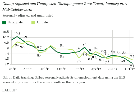 U.S. unemployment, as measured by Gallup without seasonal adjustment, is 7.3% in mid-October, down considerably from 7.9% at the end of September and at a new low since Gallup began collecting employment data in January 2010. Gallup’s seasonally adjusted unemployment rate is 7.7%, also down from September. October’s adjusted mid-month measure is also more than a percentage point lower than October 2011.