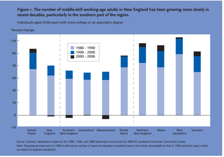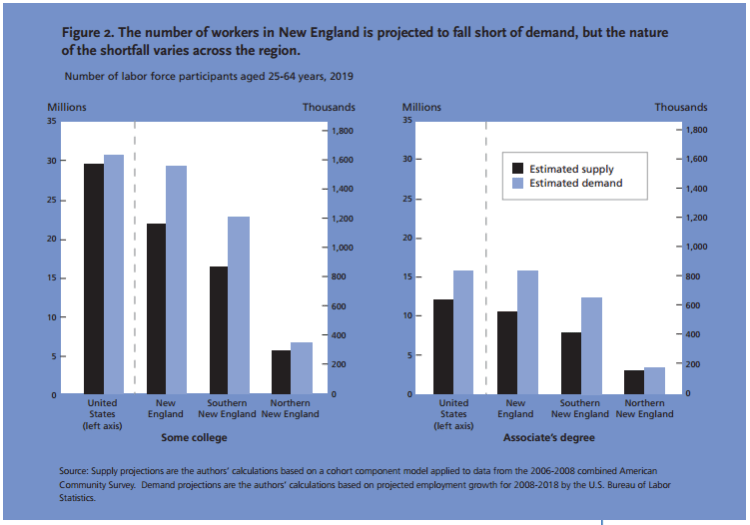 Future demand for middle-skill labor in New England will continue to outpace supply, with a shortfall among workers with either some college education or an associate’s degree.