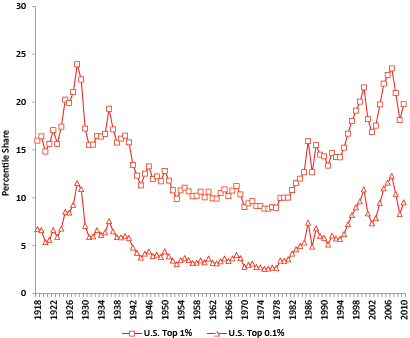 Figure 1 Share of income by individuals in the top 1% and top 0.1% 1918-2010