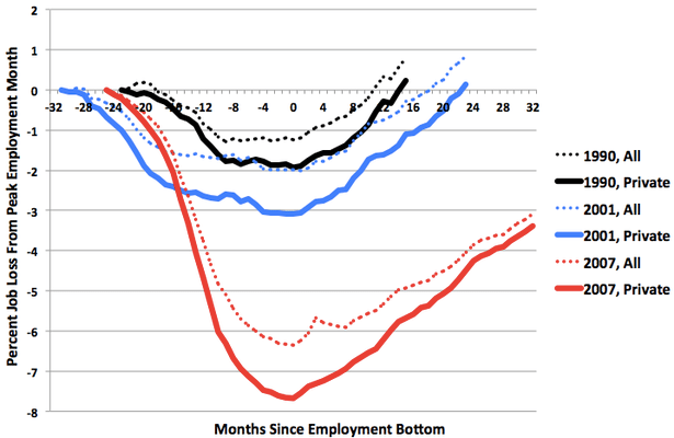 In other words, our disappointing recovery isn’t as disappointing if just look at the private sector, though only quite. I took this chart from Bill McBride of Calculated Risk — the one Joe Weisenthal of Business Insider calls “the scariest jobs chart ever” — and I subtracted out government jobs. That leaves us with a picture of how far the private sector has fallen during every postwar recession and how long it’s taken to get back to its pre-recession peak. The depressing reality is our private sector jobs hole is still deeper than it ever was during half of all other recessions, even after the past three years of recovery. (Note: This measures the percent of private sector jobs lost from the previous private sector peak).