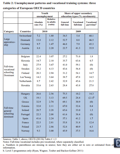 Countries with large apprenticeship systems mostly have lower youth unemployment, both absolutely and relative to adults, than do those that rely on full-time schooling at upper secondary level, whether general or vocational .