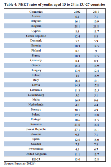 Some youths are neither employed nor in education or training (NEET). Table 4 shows the NEET rates of young people aged 15 to 24 for the EU-27 countries. The NEET rates are especially high in Southern Europe (Spain 18.0%, Italy 19.1% and Greece 14.9%) as well as in Ireland (18.9%) and Bulgaria (21.8%). Given the social costs mentioned above, in several European countries the share of jobless and inactive youths is alarmingly large.