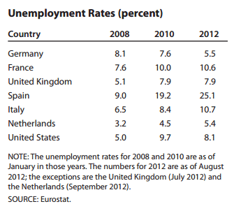 The table shows that the U.S. unemployment rate was initially lower than the unemployment rate in most European countries. While the U.S. unemployment rate has been falling from its high of 9.7 percent in January 2010, the unemployment rate in European countries (except Germany) has been on an upward trend since 2008…