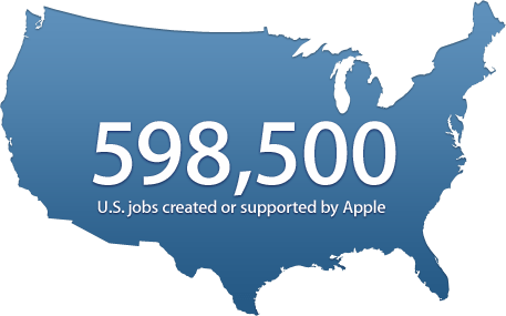 Based on a study by Analysis Group in February 2012, Apple has directly or indirectly created 307,250 U.S. jobs.* These jobs — spread across all 50 states — include thousands of jobs in numerous industries, from the people who create components for our products to the people who build the planes and trucks that carry them to our customers. For example, this figure also includes workers in Texas who manufacture processors for iOS products, Corning employees in Kentucky and New York who create the majority of the glass for iPhone, and FedEx and UPS employees. Together with the 291,250 iOS jobs generated by the app economy, these 307,250 jobs make a total of 598,500 U.S. jobs created or supported by Apple…