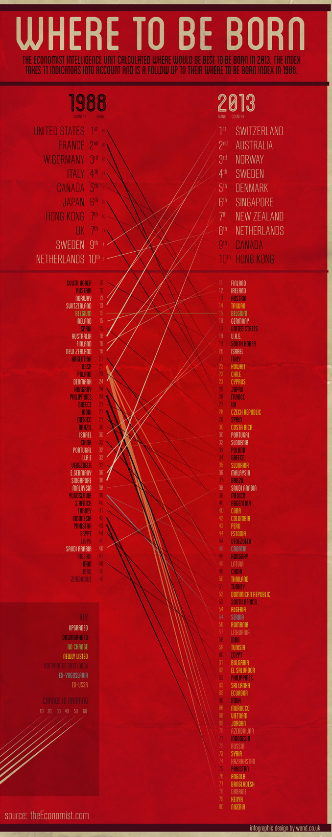 decided to design this infographic ‘Where To Be Born’ after reading and being fascniated by a post on the Economist’s website. The Economist Intelligence Unit created a ‘Where To Be Born Index’ in 1988 and now in 2013 after what they call an ‘earnest’ calculation, they have once again decided where it is best to be born in the world.