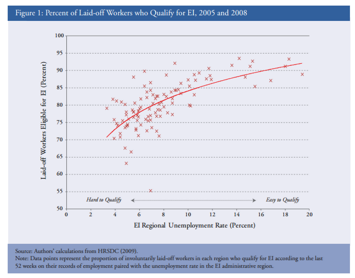 They remark : “The recent recession led to public concerns that too few laid-off workers – particularly those in low-unemployment regions facing relatively stringent entrance requirements – are eligible for EI benefits. Across Canada, the range of EI participation is wide and, not surprisingly, varies substantially according to the strictness of the entrance requirements determined by the regional unemployment rate”.