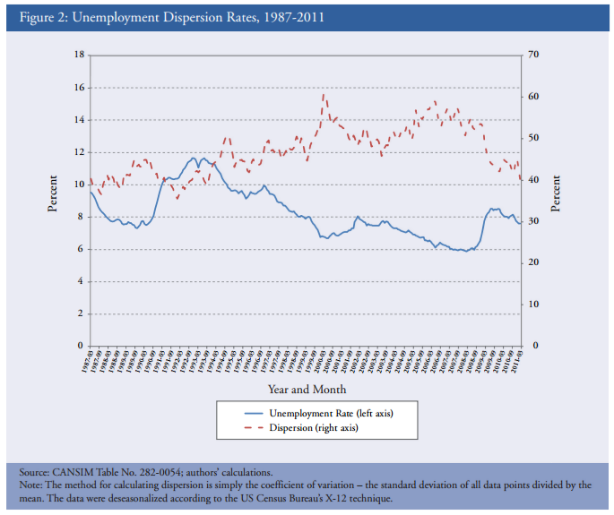 “Canada’s recent labour market history, however, shows that the opposite is true: as the national labour market improves and the aggregate unemployment rate falls, the degree of unemployment dispersion tends to rise.”