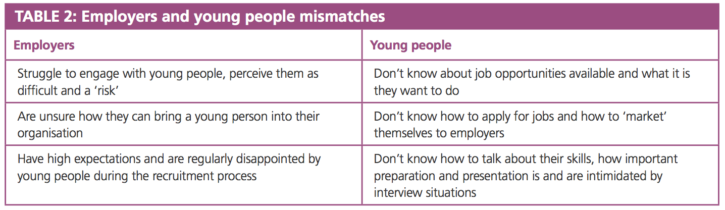 Poor careers advice and guidance in schools, coupled with a lack of support available to young people during the transition from education to work, means that many young people have little understanding of the world of work and don’t know where to turn to or how to improve their chances of finding a job.