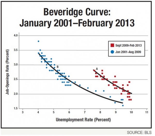 It has been almost four years since the end of the recent recession, but the U.S. has yet to return to its previous levels of unemployment. The shift in the Beveridge curve suggests that it may never do so. The points labeled A and B illustrate why. In February 2013, the job-openings rate (unfilled jobs as a percentage of total jobs) was 2.8, a rate that would have corresponded with an unemployment rate of about 5.2% on the Beveridge curve from 2001 through August 2009. The unemployment rate in February, however, was 7.7%—almost two and a half points higher.