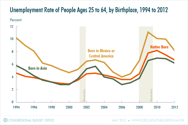 via CBO | Snapshot of the Unemployment Rate of People Ages 25 to 64, by Birthplace, 1994 to 2012.