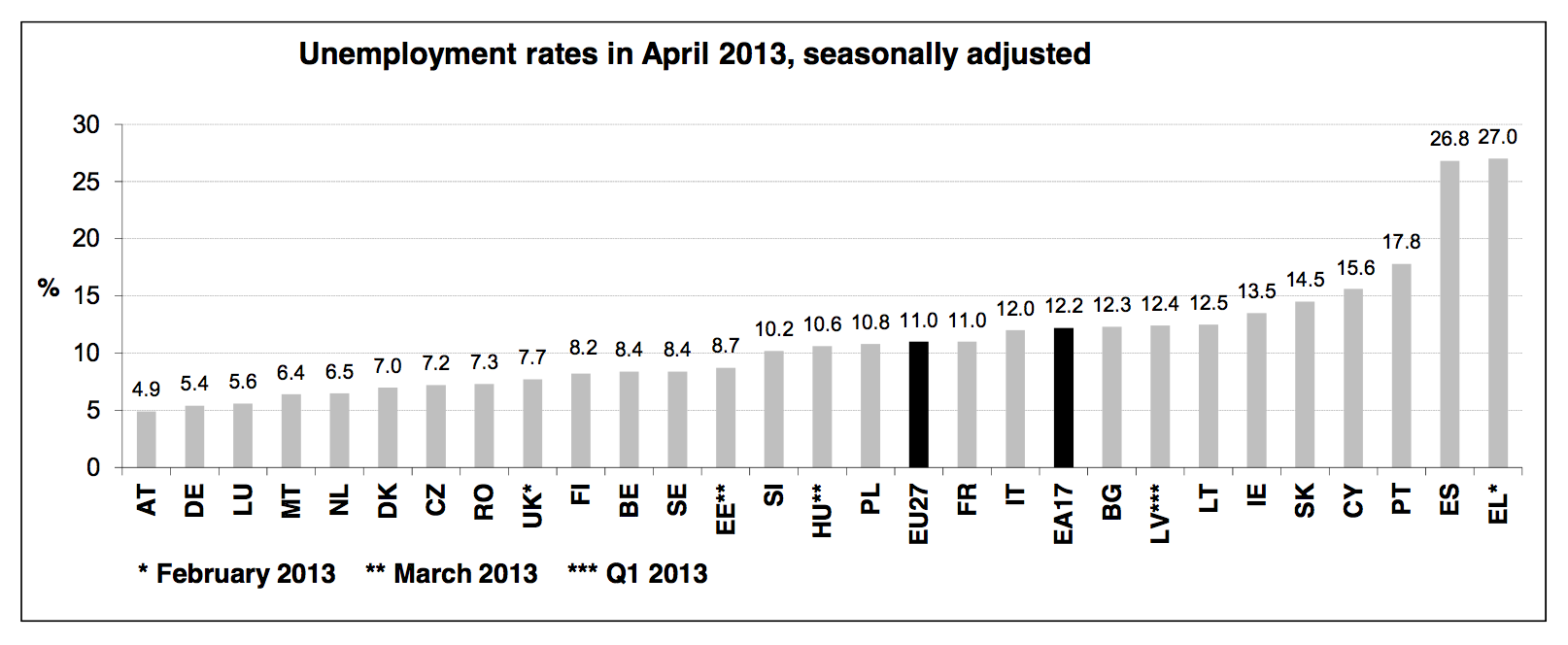 The euro area (EA17) seasonally-adjusted unemployment rate was 12.2% in April 2013, up from 12.1% in March. The EU271 unemployment rate was 11.0%, unchanged compared with the previous month4. In both zones, rates have risen markedly compared with April 2012, when they were 11.2% and 10.3% respectively. These figures are published by Eurostat, the statistical office of the European Union.