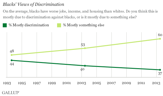 Black Americans are significantly less likely now than they were 20 years ago to cite discrimination as the main reason blacks on average have worse jobs, income, and housing than whites. Today, 37% of blacks say these differences are due to discrimination and 60% say they are caused by something else. In 1993, 44% said such differences were due to discrimination and 48% something else.