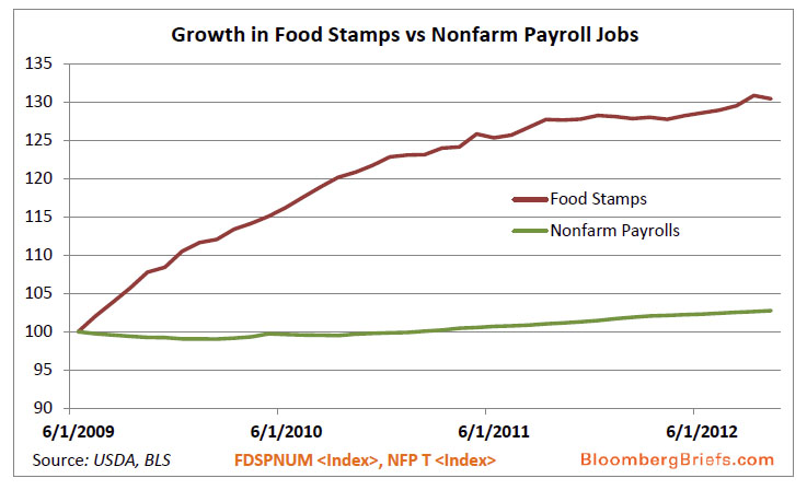 - Food stamps skyrocket as unemployment rates remain flat. “From October 2009 to October 2012 the unemployment rate has declined from 10.2 percent to 7.9 percent [the same rate as January 2013]. In that same time frame, nearly ten million new recipients have been added to the food stamp rolls…” (Daily Caller)