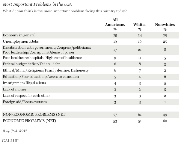 One in four Americans name the economy as the most important problem facing the country today, followed by unemployment and jobs at 19%, and dissatisfaction with government at 17%. Nonwhites (25%) are much more likely than whites (16%) to say unemployment is the most important problem; this issue ranks behind dissatisfaction with government among whites. The economy ranks first for both groups.