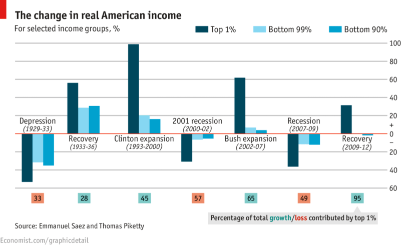 THE recovery belongs to the rich. It seemed ominous in 2007 when the share of national income flowing to America’s top 1% of earners reached 18.3%: the highest since just before the crash of 1929. But whereas the Depression kicked off a long era of even income growth the rich have done much better this time round. New data assembled by Emmanuel Saez, of the University of California, Berkeley, and Thomas Piketty, of the Paris School of Economics, reveal that the top 1% enjoyed real income growth of 31% between 2009 and 2012, compared with growth of less than 1% for the bottom 99%. Income actually shrank for the bottom 90% of earners. After the Depression households across the income spectrum enjoyed income growth roughly commensurate with losses during the downturn. As a result the top 1% only captured about 28% of total income growth from 1933 to 1936. This time around 95% of the increase in American income since 2009 has gone to the top 1%. No wonder, then, that the share of national income flowing to the rich is at a record high of 19.3%, ahead of both 2007 and 1929.