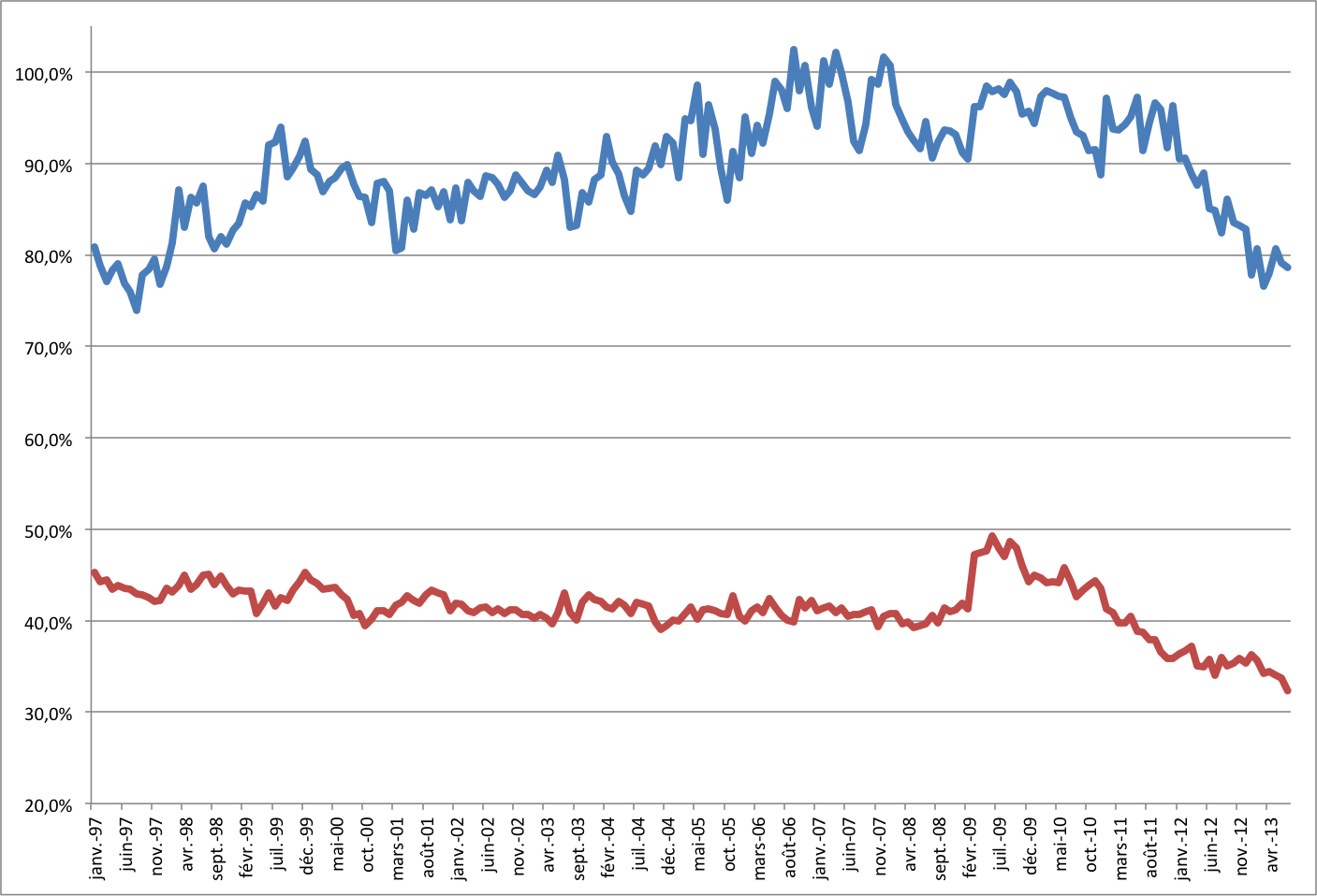 The blue line represents Atlantic Canada, the red line, the Rest of Canada (date appears in french).