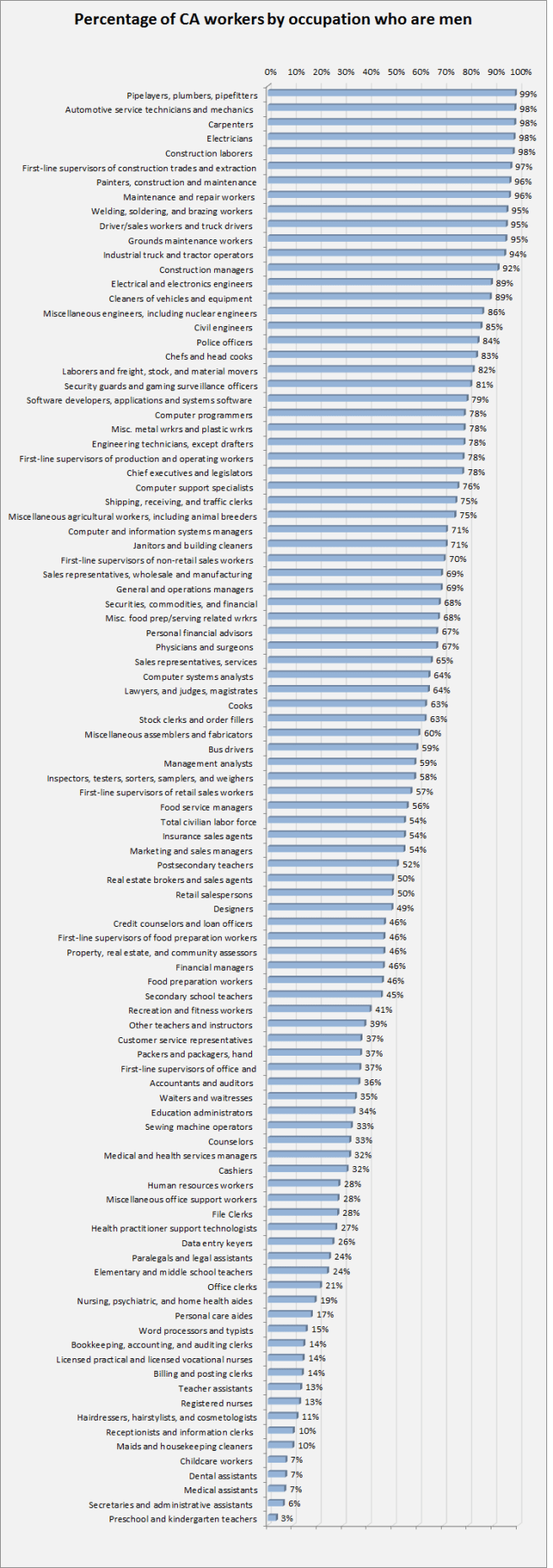 Of the 100 most common occupations in California, only 20 have roughly an equal number of male and female workers, according to the data, which come via the state Department of Finance.