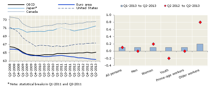 The OECD employment rate increased for all population groups in the second quarter of 2013. However, the employment rate for youth was still 0.2 percentage point lower than one year ago, while it was 0.8 percentage points higher for older workers and unchanged for prime age workers.