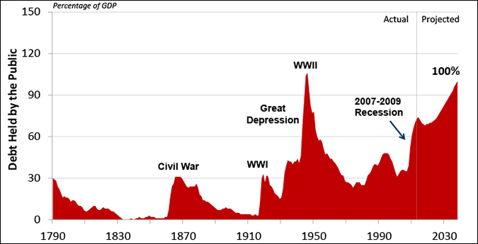 In its 2013 Long-Term Budget Outlook, the Congressional Budget Office (CBO) issued a warning that the national debt is near an all-time high and will grow to unsustainable levels. Currently, the federal debt is about 73 percent of GDP. CBO projects that debt will climb to 100 percent of GDP within 25 years. This assumes, however, that current law will not be changed and discretionary spending will decline to historically low levels. Under more pessimistic assumptions, debt could grow to 190 percent of GDP by 2038.