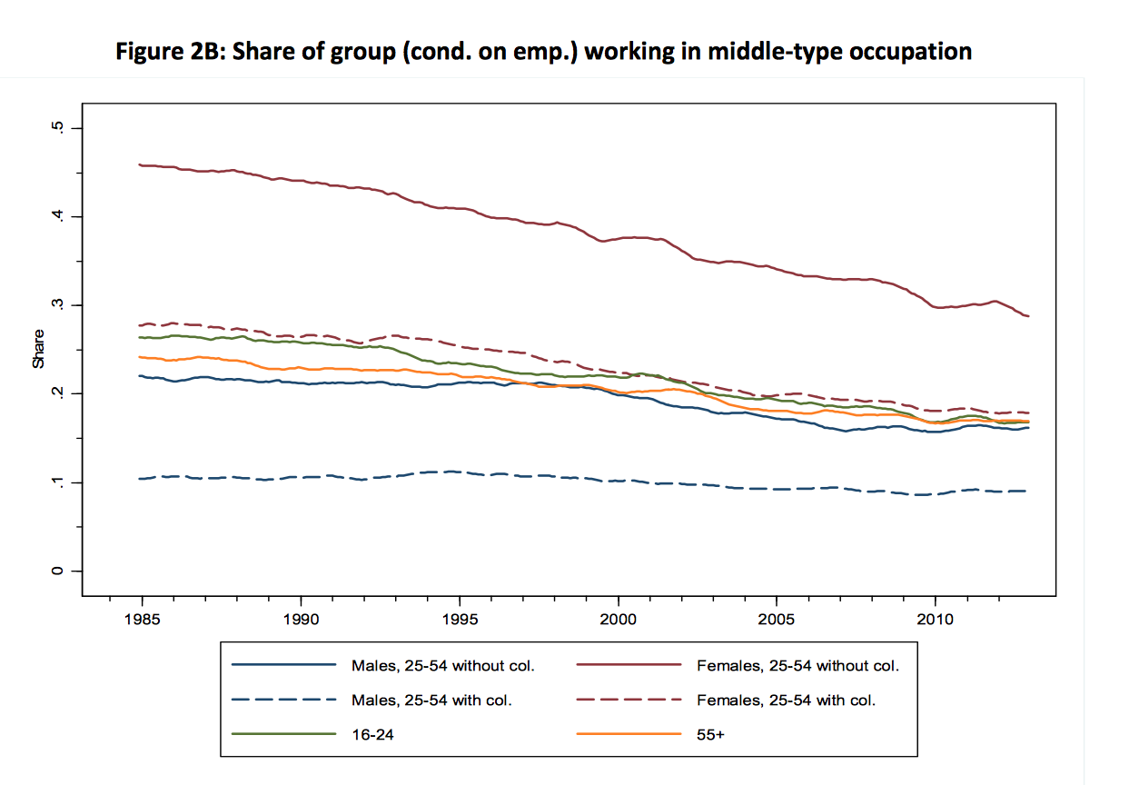 To summarize: the share in middle-type jobs has fallen for all types of workers. The declines have been most significant for younger workers and non-college workers, and for these groups the decline in middle-type employment has been almost entirely mirrored by an increase in low-type employment. And even for college-educated workers, there is a modest increase in the share employed in low-type jobs since the early 2000s.