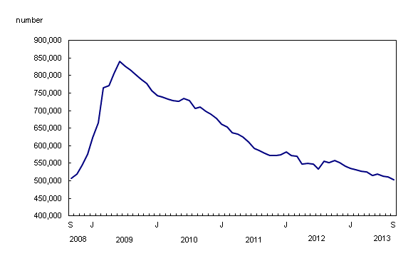 Following three months of little change, the number of people receiving regular Employment Insurance (EI) benefits decreased slightly in September (-1.4% or -7,100) to 503,800. Compared with September 2012, the number of beneficiaries was down 8.8%.