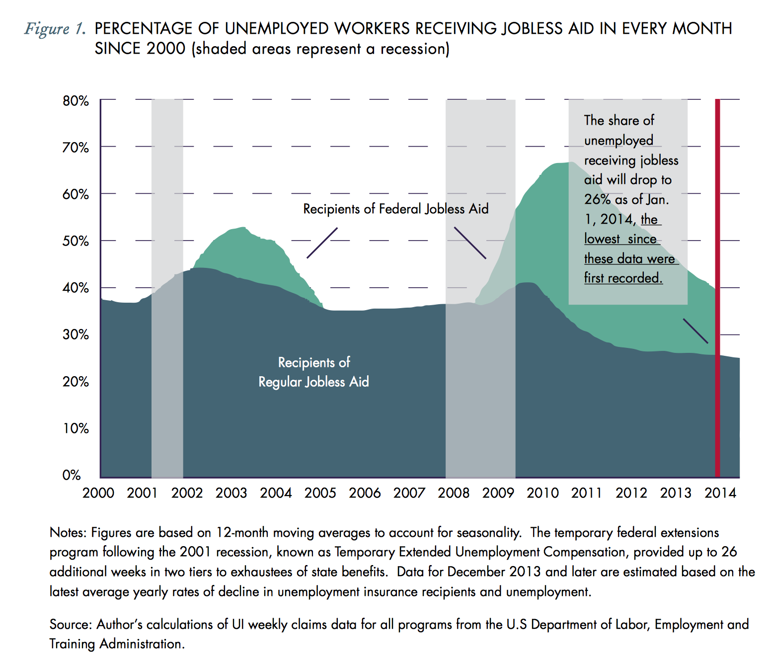 As documented in this brief, absent a renewal of the Emergency Unemployment Compensation (EUC) pro- gram by Congress, just one in four unemployed workers (26 percent) will be receiving jobless aid as of January 2014. Not only is this the lowest share during this downturn, it is the lowest since the U.S. Depart- ment of Labor first started recording this information in 1950. This swift drop in coverage will occur amid already falling numbers of jobless workers receiving aid, and despite the fact that the labor market is still weaker than it was before the recession began in December 2007 and before Congress first authorized the EUC program in June 2008.