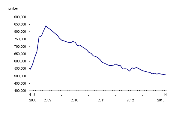 There were 512,300 people receiving regular Employment Insurance (EI) benefits in November, virtually unchanged from October. The number of beneficiaries has been relatively stable since May 2013.