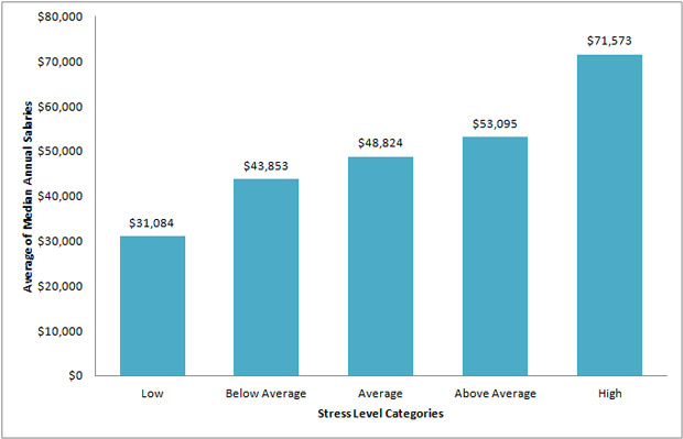 These figures don’t exactly show that there is a causal link between stress and high pay (“If only having ulcer-inducing stress magically created bigger paychecks,” some of us may dreamily sigh). Indeed, some of the differences between categories are not that large – the pay gap between jobs that are “below-average” and “average” in stress is about $5,000, and between “average” and “above-average” stress-level jobs, it’s about $4,300.